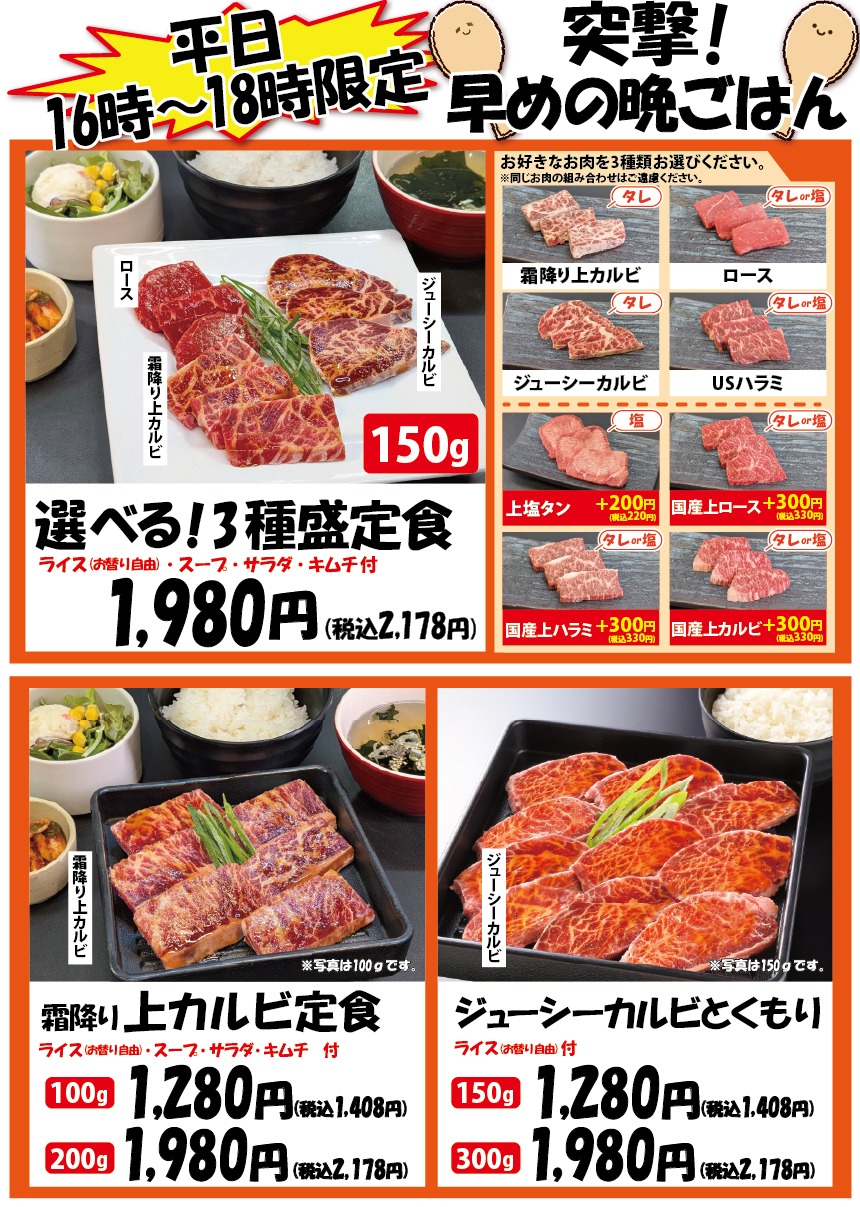 「焼肉ファミリーレストラン赤門」全11店舗で、『突撃!早めの晩御飯』メニューがスタートいたしました。