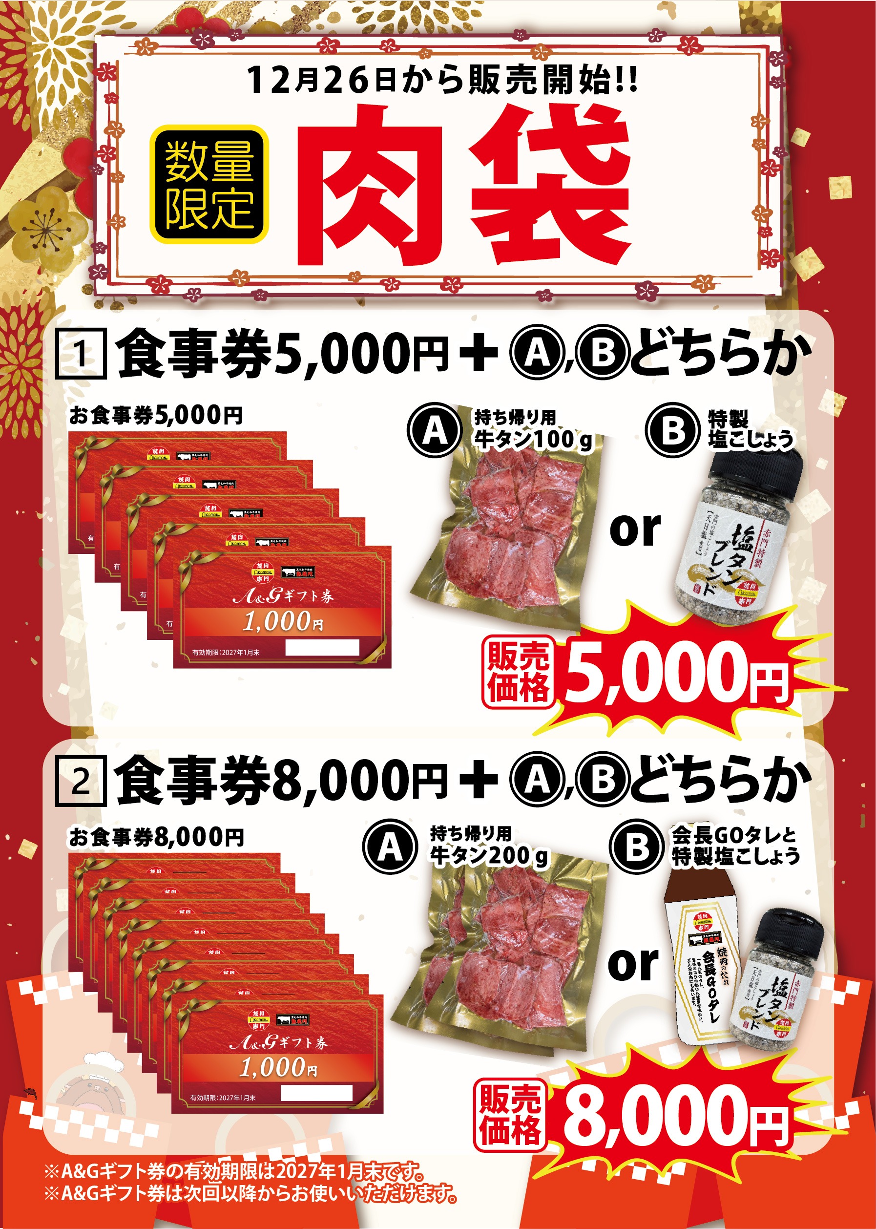 2⃣お食事券8,000円+Ⓐ牛タン200g または Ⓑ会長GOタレ&特製塩こしょうセット