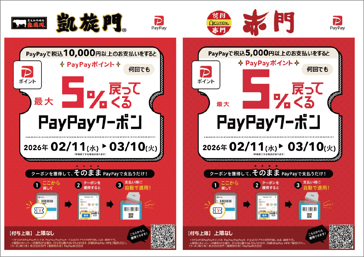 のお支払で最大5%戻ってくるPayPayクーポンを配布いたします!